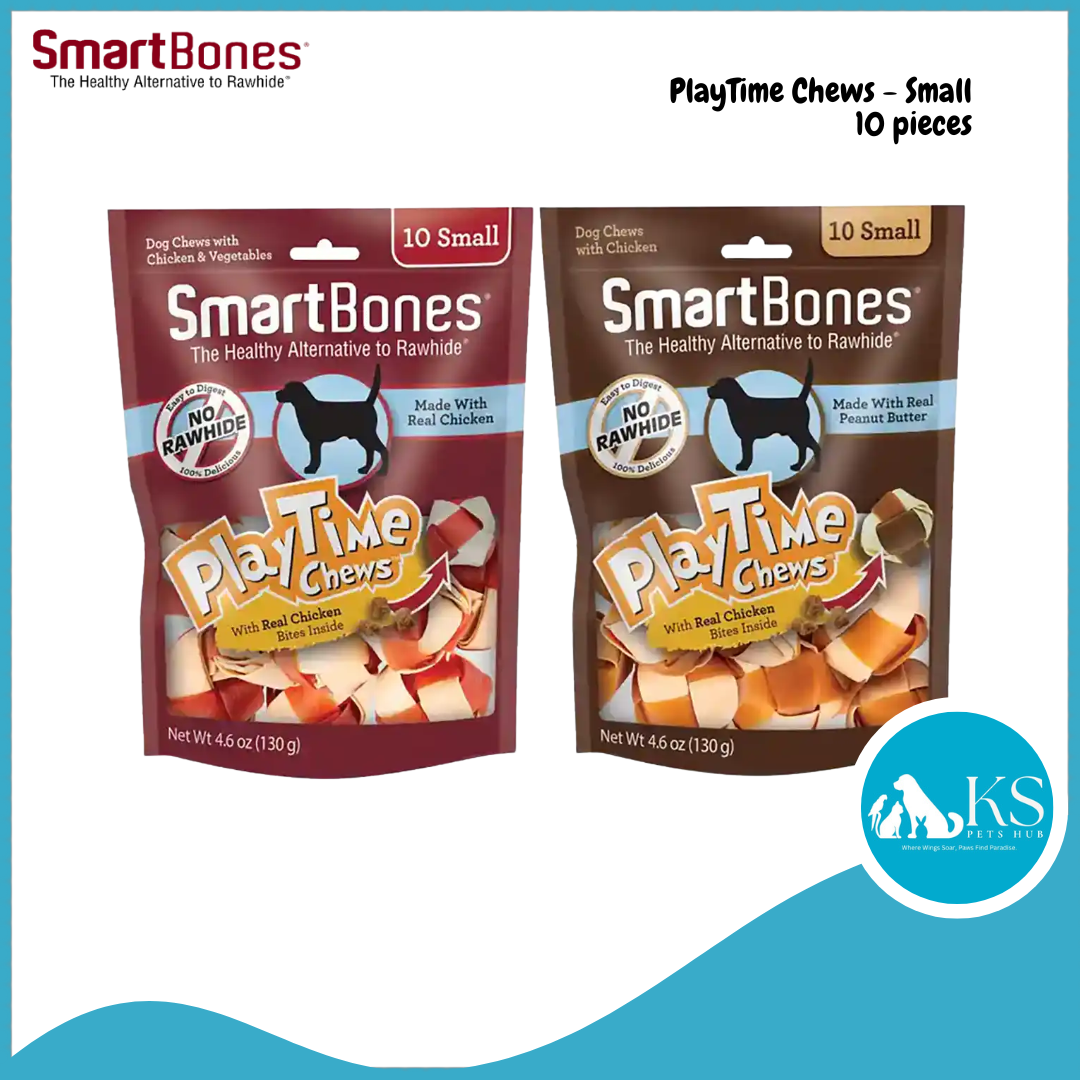 SmartBones® have all the benefits of a rawhide chew…WITHOUT the RAWHIDE! NO RAWHIDE SmartBones® PlayTime Chews are made with REAL CHICKEN and wholesome VEGETABLES, and have chicken surprise treats inside for lots of shake, rattle and roll fun play, and a scrumptious taste dogs can’t resist!