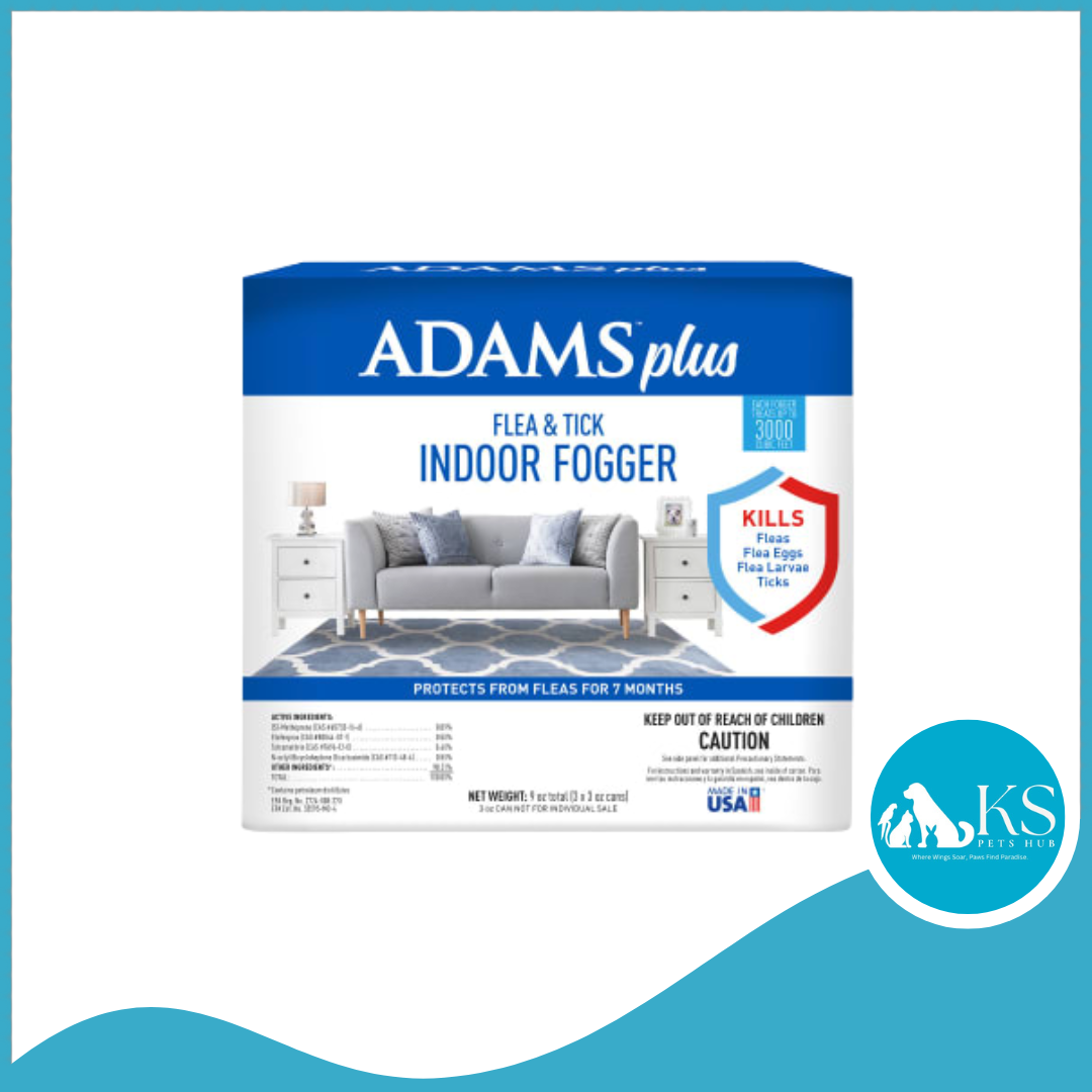 ADAMS Plus Flea & Tick Indoor Fogger kills fleas, flea eggs and larvae, ticks, cockroaches, ants, spiders, mosquitoes, silverfish, earwigs, wasps, and flies. One easy-to-use fogger covers 3000 cubic feet and is stain-free. It's formulated with (S)-Methoprene to help kill and prevent the development of fleas, protecting your home for up to seven months. With 5% of fleas living on your pet and the remaining 95% living in your home or yard, ADAMS products are designed to provide you with the power to prevent pests in your home and in your yard. To complete your flea and tick control system try one of the many ADAMS flea and tick collars designed specifically for your dog, puppy, cat, or kitten. Also try ADAMS Flea & Tick Home Spray, specifically designed to use inside your home and ADAMS Yard & Garden Spray, designed to use outside in your yard.