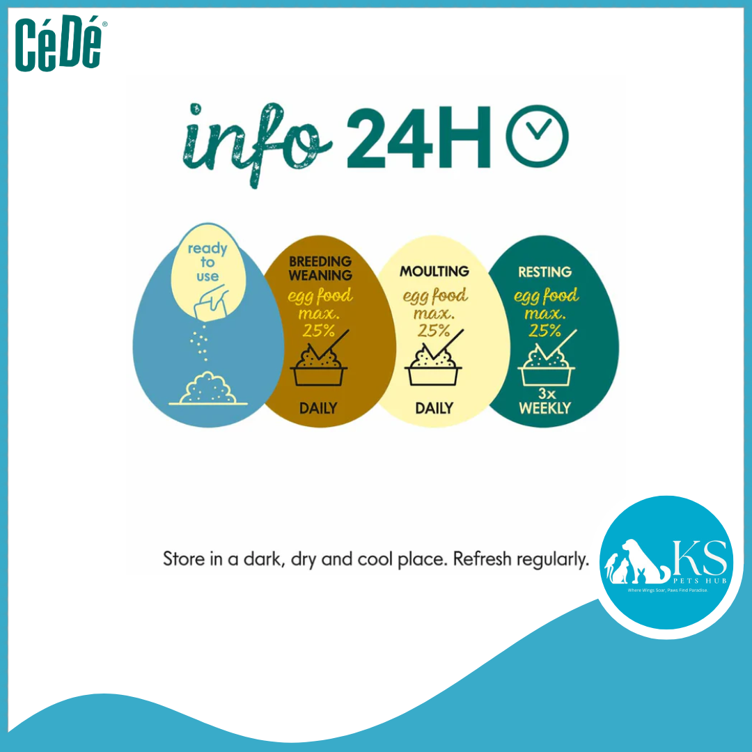 - Moisten with a few drops of water, germinated seeds … Resting period: 2 to 3 times a week administer max. 25% of the daily ration. Breeding period: administer CéDé eggfood daily, when possible 2 or 3 times a day, from weaning administer daily max. 25% of the ration CéDé eggfood. Moulting period: administer max. 25% of the daily ration CéDé eggfood. Store in a dark, dry and cool place.